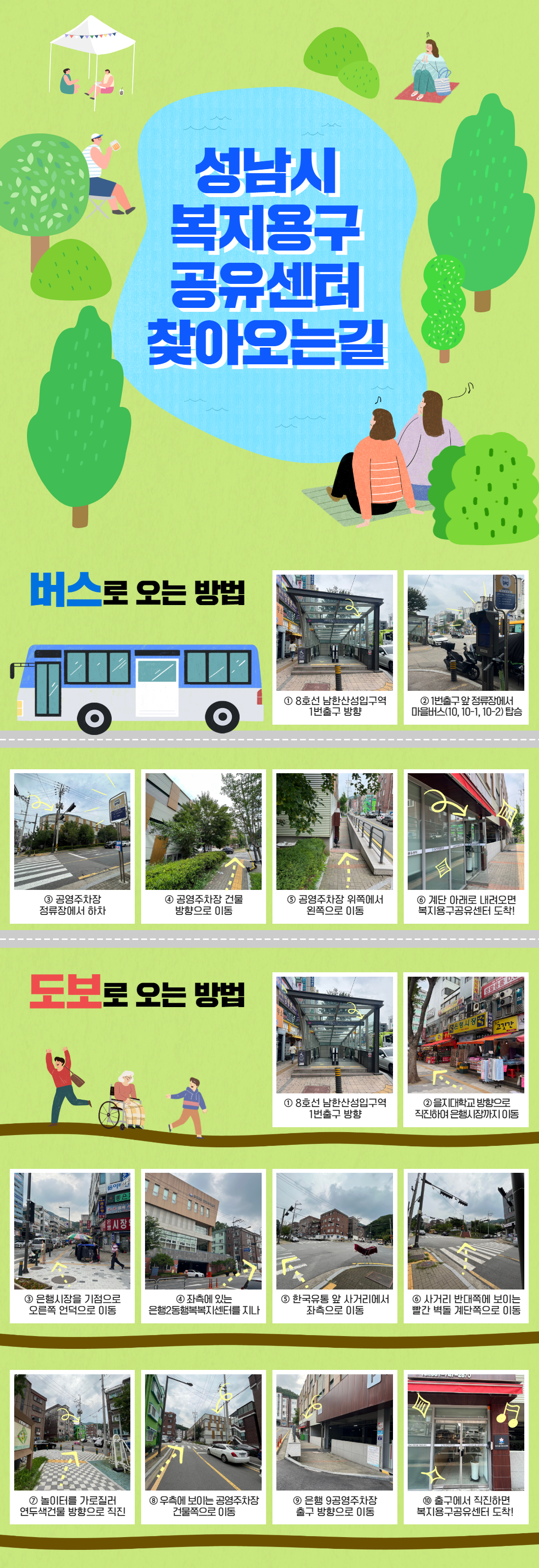 - 분당구 방면 : 51번, 340번 일반버스 탑승후 세이브존맞은편역 하차 후 10번, 10-1번, 10-2번 마을버스 환승 후 은행동제9공영주차장 정류장 하차